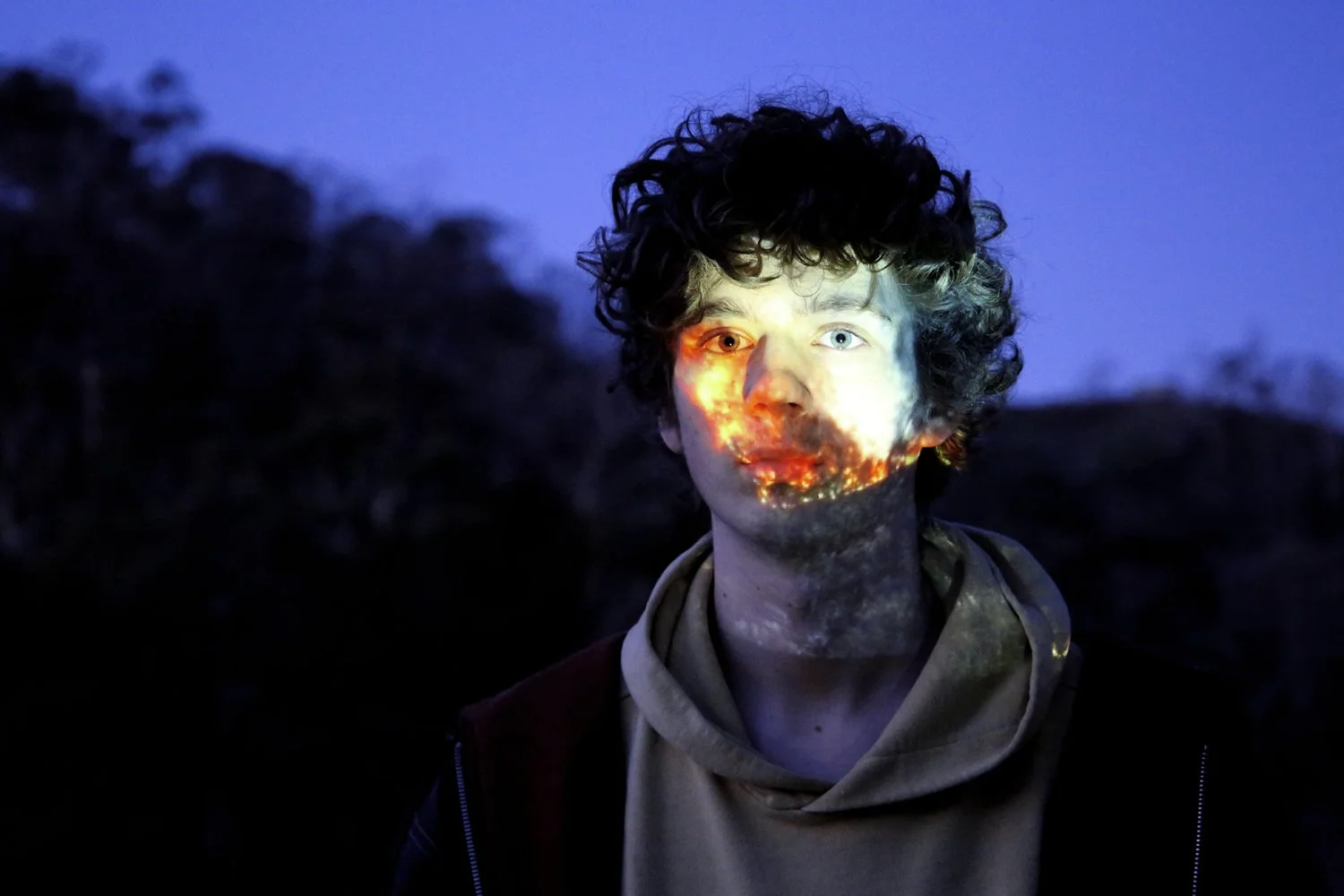 These photo-based artworks were created during COVID lockdown years 2019 - 2021. I was struck by legacy that we were leaving our young people. ‘On Fire’ is a portrait my eldest son. The summer before the ridge above our house was on fire - the flames burnt right up to our back fence, I photographed my son in front of the burnt ridge at dusk with fire projected across his face, simulating the experience he had faced when his home was at risk. ‘On Strike’ speaks of his anger and sense of betrayal, when he marched with his friends pleading to the world to make changes towards zero emissions before it was too late.