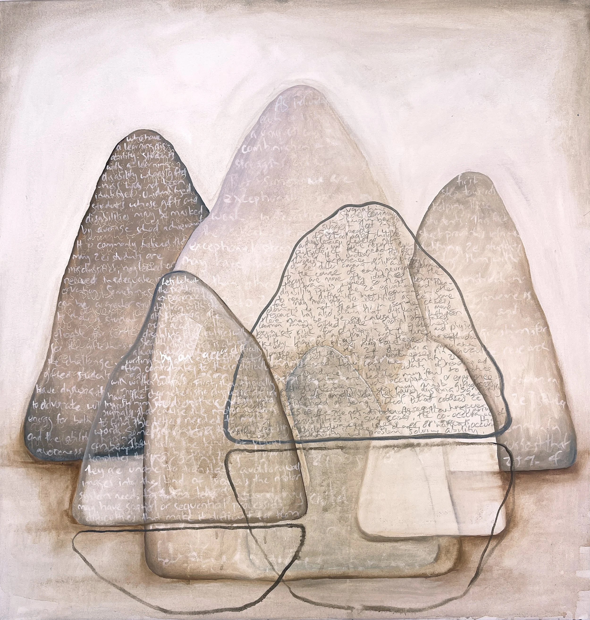 Diverse Elements was the first my first solo exhibition in Naarm/Melbourne for ten years. It featured my initial practiced-Based research from my PhD in Visual Art. The exhibition was divided into four series or chapters, Mountain Out Of Words, The Swing, Finding Difference and Solace. Each of these chapters related to a different aspect of my research and focused on different materials, painting, photography, digital and video, as well as, artistic responses. My research titled Visualising the Invisible: An investigation into dyslexia and absence through visual art practice, explores dyslexia from lived experience.